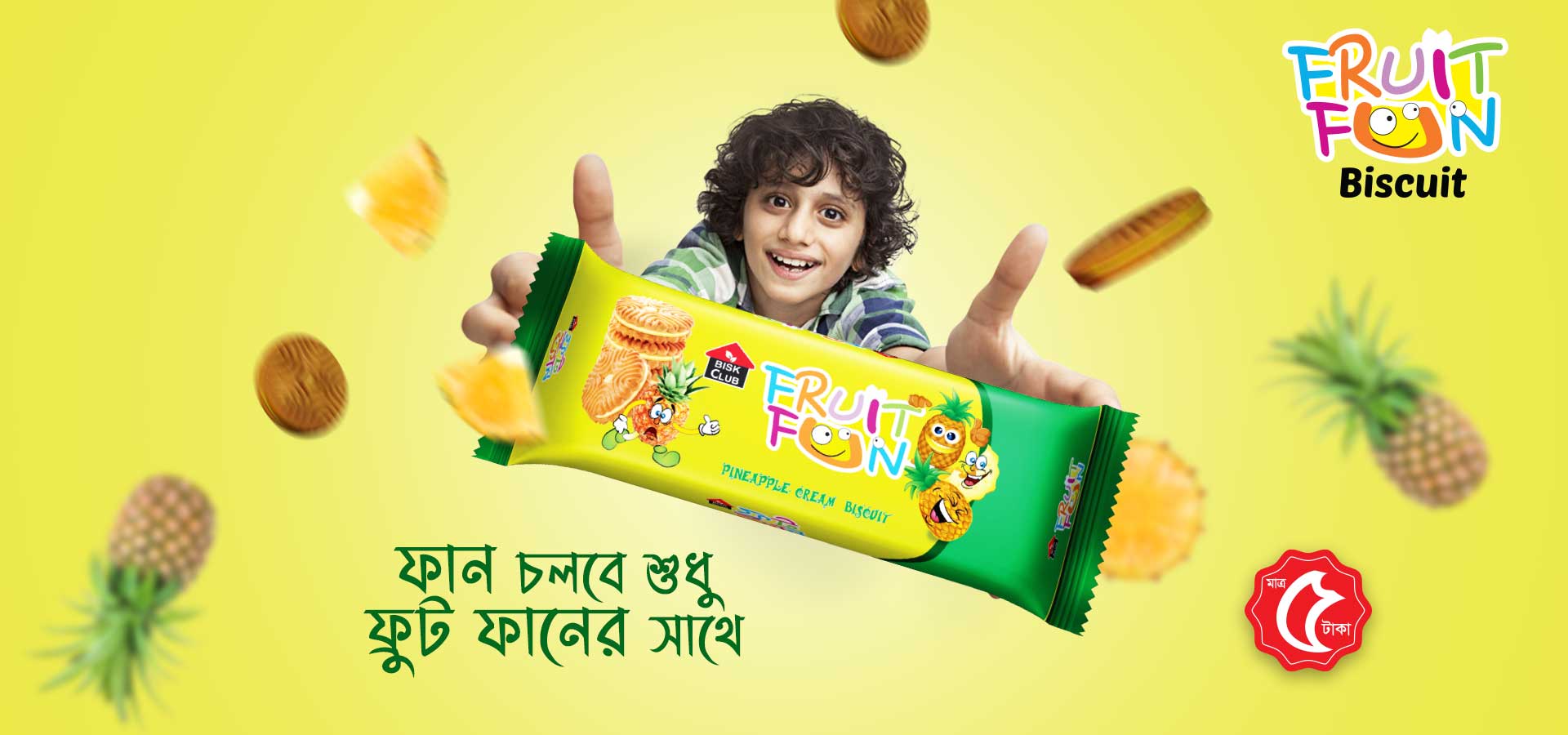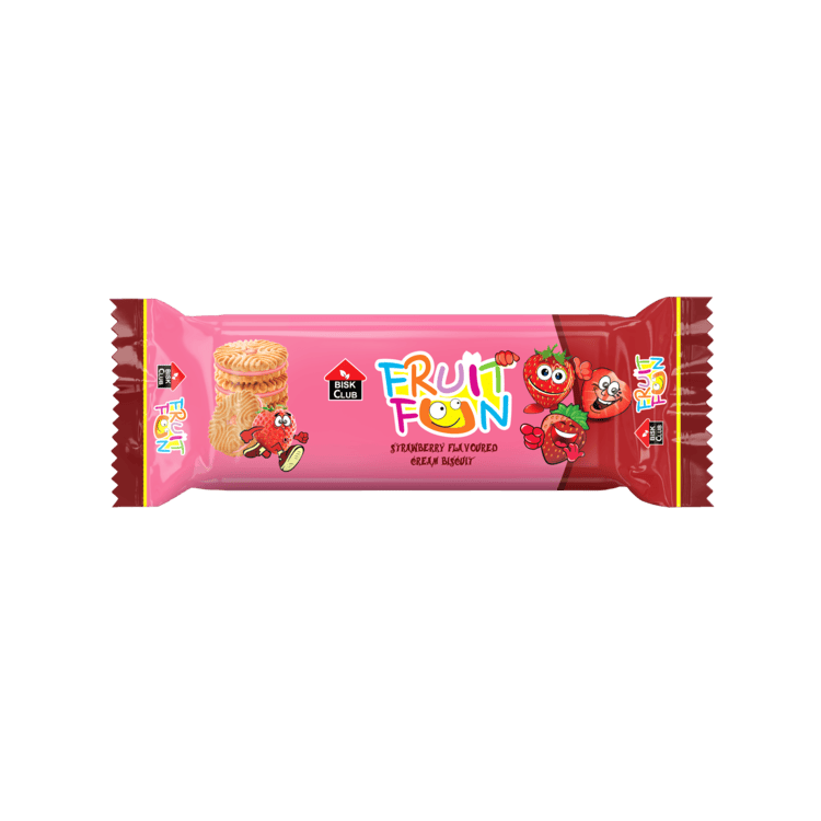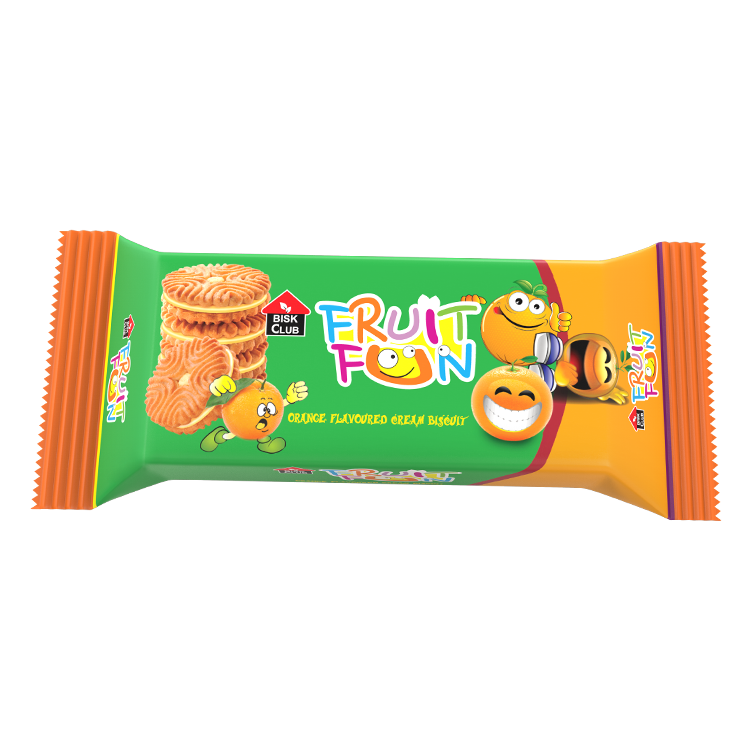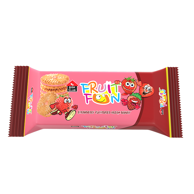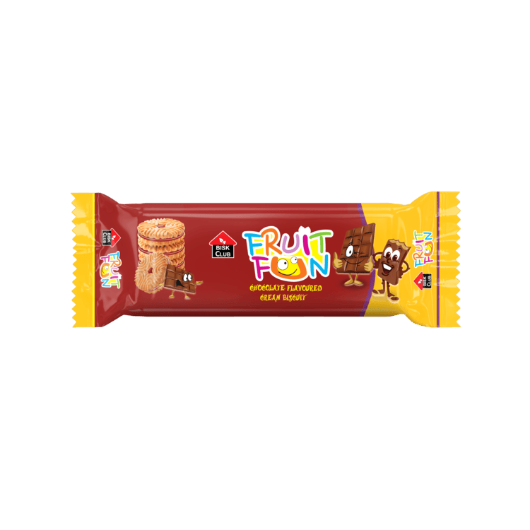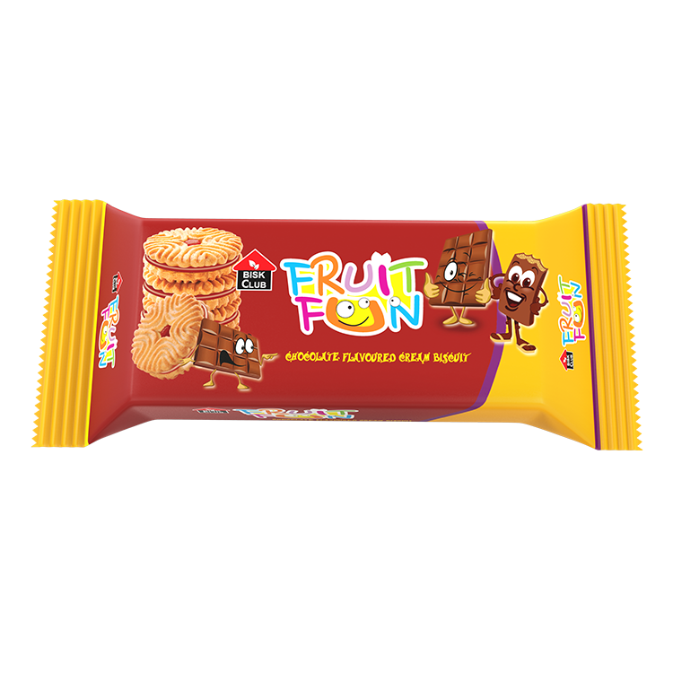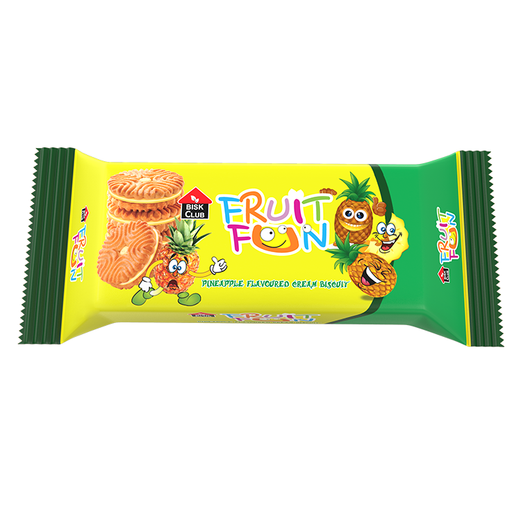 Fruit Fun is a sandwich cream biscuit which is the solution for light snacks at break time. Pineapple and Chocolate flavored cream Biscuit with unique taste and crispiness.