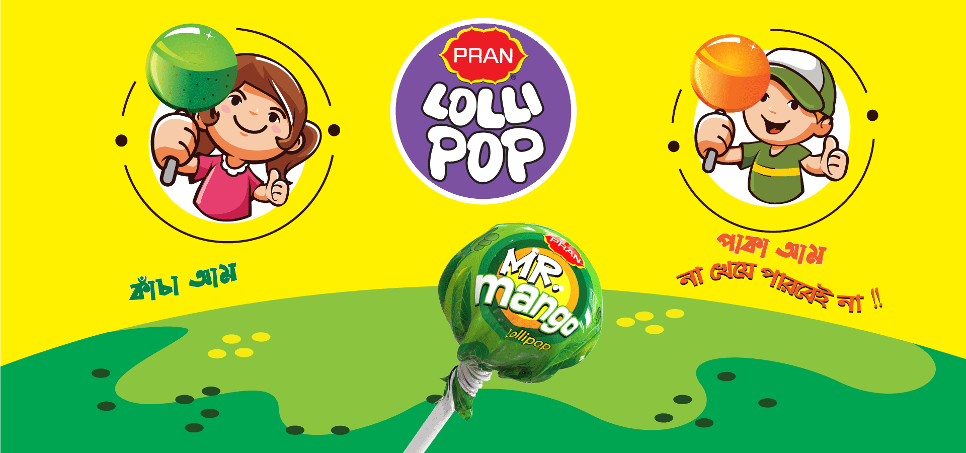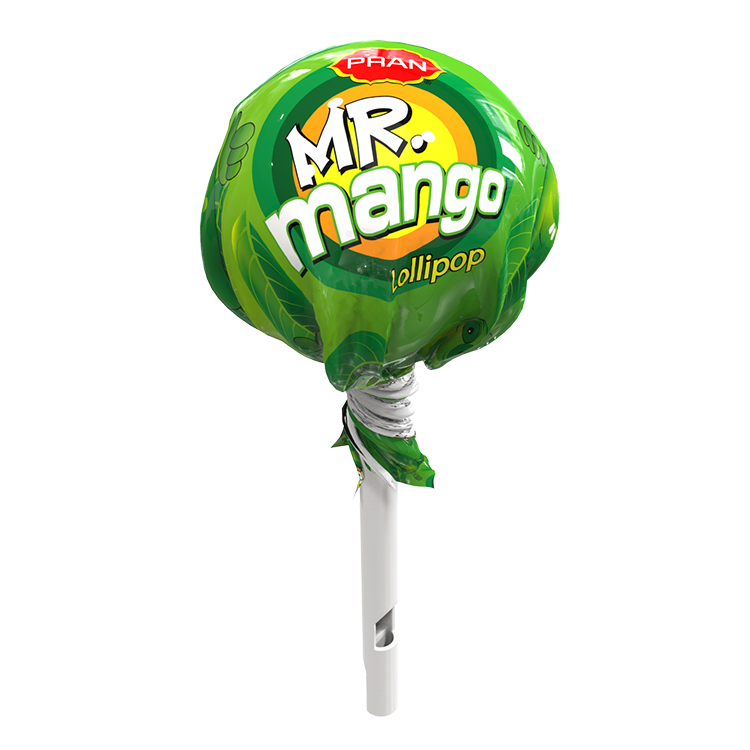 Mr. Mango lollipop is a rounded Hard Boiled candy on a Whistle stick and comes Two mouth-watering fruit flavors Ripe Mango & Green Mango, manufactured by PRAN Dairy Ltd. and sold locally & internationally. It is has different design foil paper for flavors