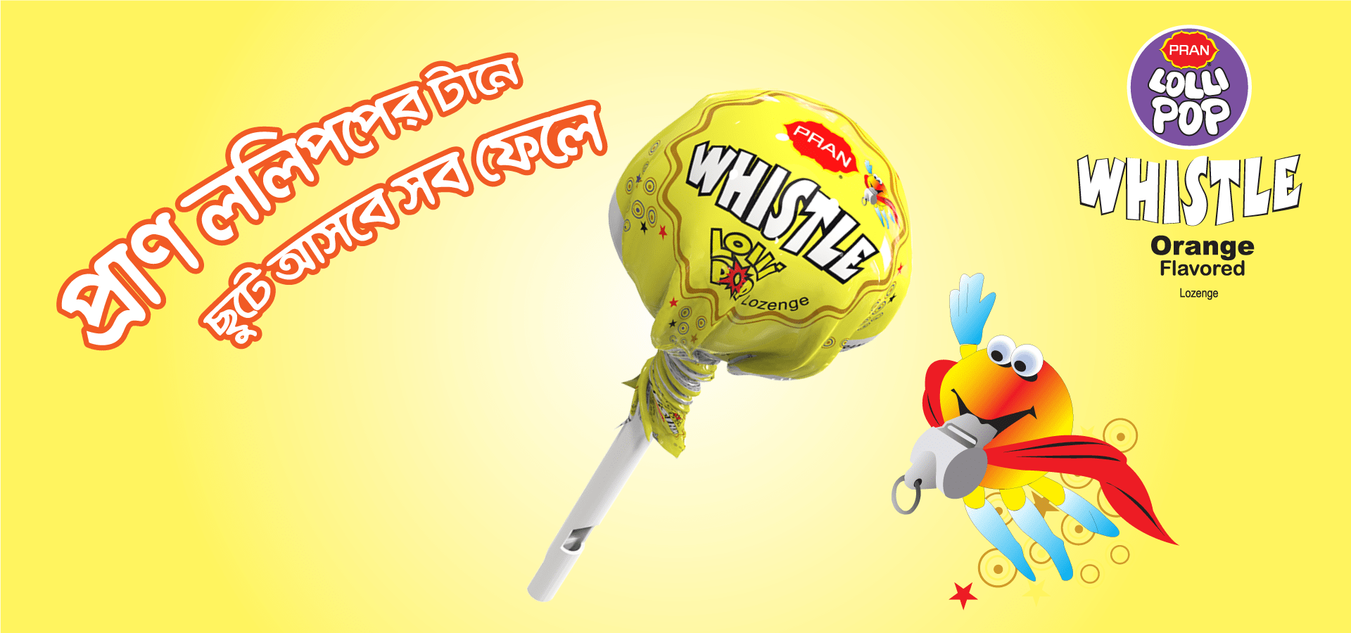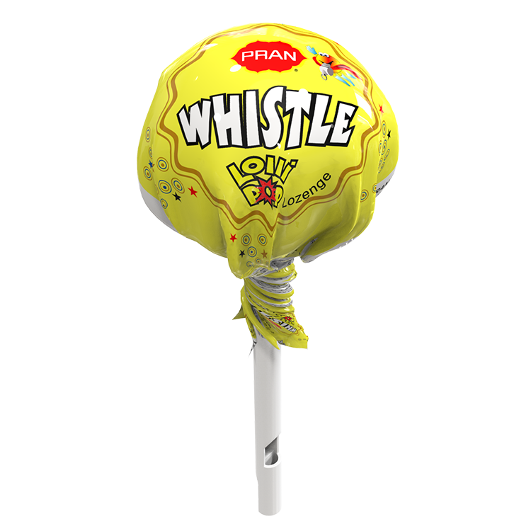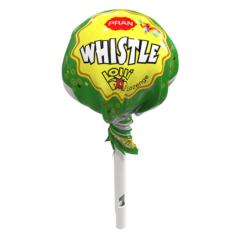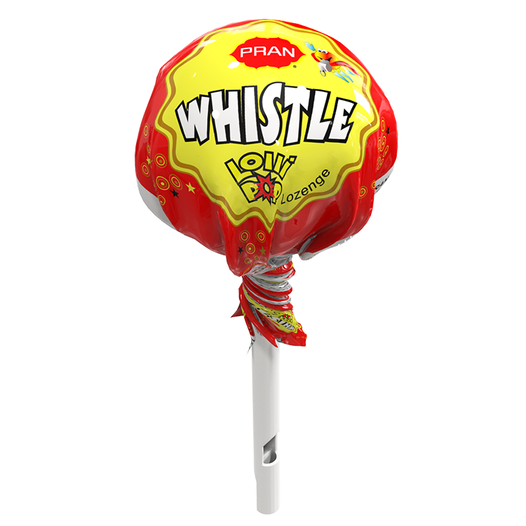 Whistle Lollipop is a rounded Hard Boiled candy on a Whistle stick and comes several mouth-watering fruit flavors, manufactured by PRAN Dairy Ltd. and sold locally & internationally. It is has different design foil paper for different flavors.